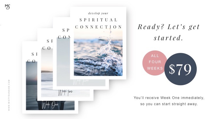 Week One: Reframe and challenge the beliefs and perceptions you have about spirituality. Figure out where you are now (spiritually speaking) and set your intentions for the next four weeks. Prep your mind for two-way communication with guided meditation.